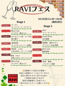 音楽あり、お食事あり、ヨガや整体、フリーマーケットなど
